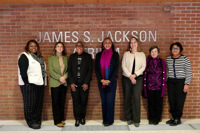 Above [left]: NSAL interviewers and Stephanie Chardoul during the panel discussion; Above [right]: Dr. Robinson presenting at the event; Below: Project leadership posing in the James S. Jackson atrium at ISR at the reception.