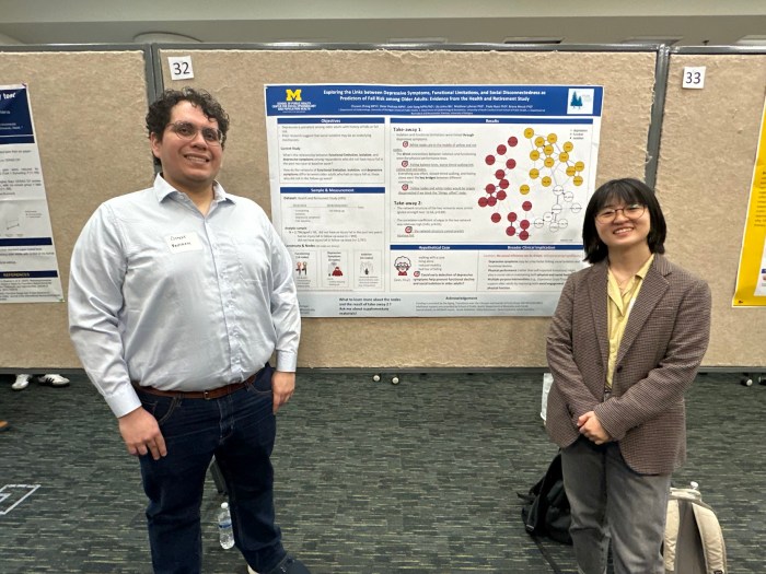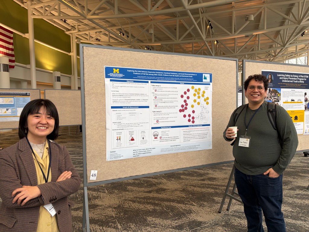 Lastly, Omar and first-year PhD student Chuwen (Cullen) Zhong co-presented their work on the relationship between social connection, depression, and fall risk at the IPC poster session (pictured on the left).