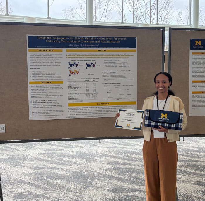 UMAging. Many of our team members attended the UMAging Symposium, which was a great opportunity to connect with our colleagues and collaborators from different research centers and departments and hear about the work they are doing. As a MCUAAAR faculty member, Dr. Mezuk gave a research talk on “Sense-making in the Acute Aftermath of Older Adult Suicide Deaths: An Application of Large Language Models”, which highlights key findings from our analysis exploring meaning-making in NVDRS data, which is led by Dr. Kalesnikava.