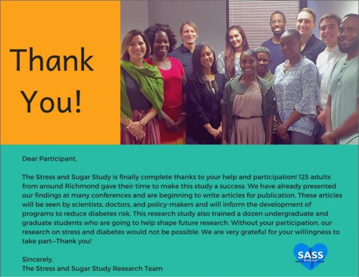 Thank you to everyone who participated in the Richmond Stress and Sugar Study – this research would not be possible without you!